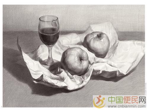 12.第一节先拉直线,了解画素描的笔触,感觉来自www.cnbianmin.com。开始学单个简单石膏体的结构,画法,阴影,一些基础画法,如正方体,圆锥,园等。后来开始画这些的组合,并慢慢加一些果子,瓶罐之类的静物www.cnbianmin.com。)